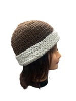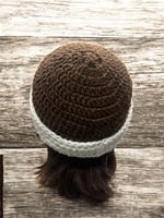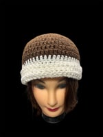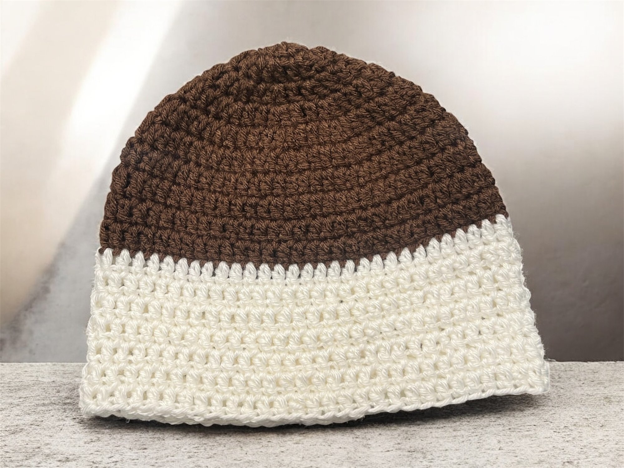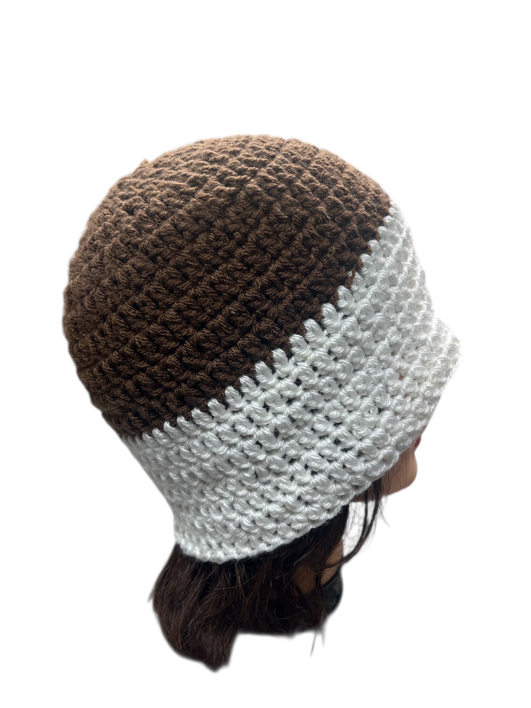 Design: Two tone crochet with a cocoa brown crown and a thick creamy white brim